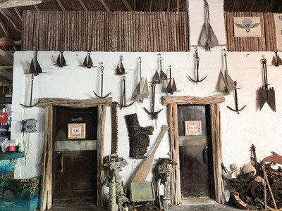 Seeing a courtyard with signage about the businesses inside, I took a peek and sure enough, the main gallery of interest to me was here. The courtyard was tall and covered by a palm frond roof and timber beams. One wall was filled with anchors of differing sizes.