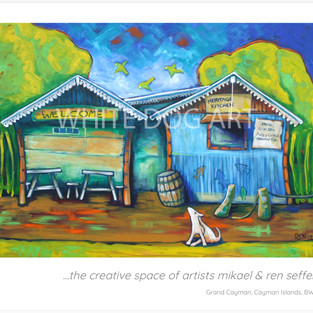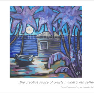 I definitely have appreciation for her style as it became very difficult to make a choice. I asked Ren to show me what her favorite piece was and to tell me why. She chose a piece with a wooden shack with palm trees in the background, boats in the water behind a bicycle out front with a little dog against the wall. It's a general store in Georgetown and is quite old. After hurricane Ivan decimated the island of Grand Cayman it was one of the few structures to withstand the fury. It's certainly a symbol of strength of Grand Cayman and it being a survivor. She also shared with me a secret that sometimes she paints over paintings and this is an example of one and she isn't feeling the vibe for what she's painting she starts a new painting but sometimes elements of the old painting are kept. She told me that you can see part of the old painting in the doorway and some of the water area behind the shack.
