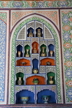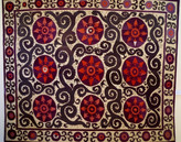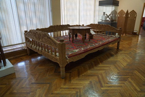We started with the Museum of Applied Arts. It's an exquisitely house with with bright ghaunch and carved wood. It was built in the 1930s at the height of the Soviet period but nonetheless serves as a gateway to the older treasures of Bukhara and Samarkand, There is a great, although small, collection of ceramics and textiles, The collection of rugs, fabric, and skill caps.